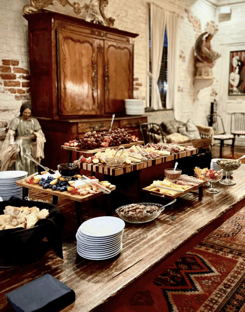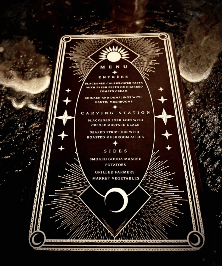 The celebration began at Race + Religious, where guests were welcomed with premium bar service and an impressive array of passed hors d’oeuvres during cocktail hour. The evening kicked off with elegant bruschetta topped with whipped ricotta, confit cherry tomatoes, and arugula pesto, alongside Creole eggplant stuffed mini peppers with roasted poblano aioli. Guests also enjoyed muffuletta canapés featuring the classic New Orleans combination of olive salad, salami, mortadella, and provolone, while seared hangar steak with roasted exotic mushroom and horseradish cream, and bacon-wrapped shrimp with pepper jelly glaze rounded out the hors d’oeuvres selection.